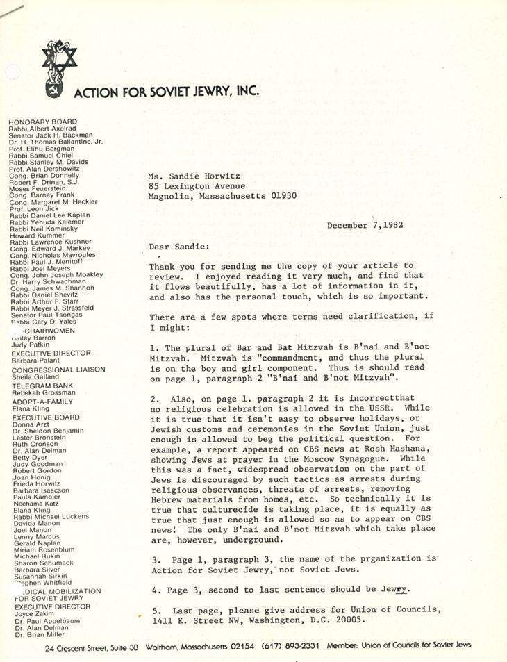 Letter suggesting edits to an upcoming article on Action for Soviet Jewry's Twinning program.