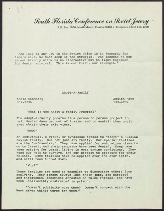 Instructions for adopt-a-family programs, how to successfully call Soviet Jews, and how to make sure packages sent to the Soviet Union reach the intended recipients.