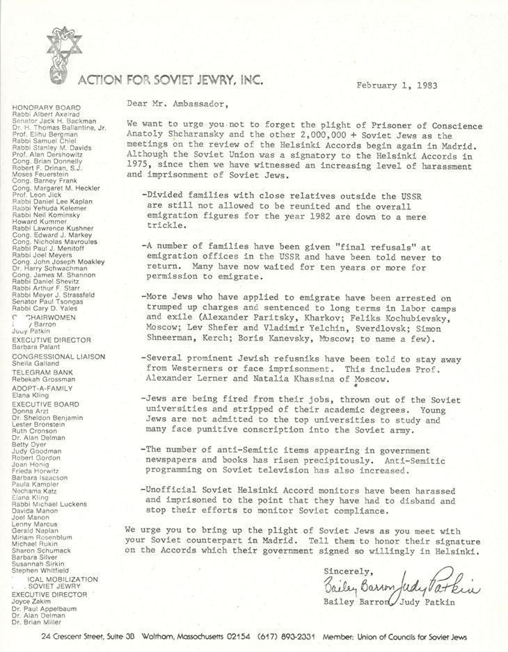 Correspondence - Bailey Barron and Judy Patkin to ambassador to Helsinki Accords