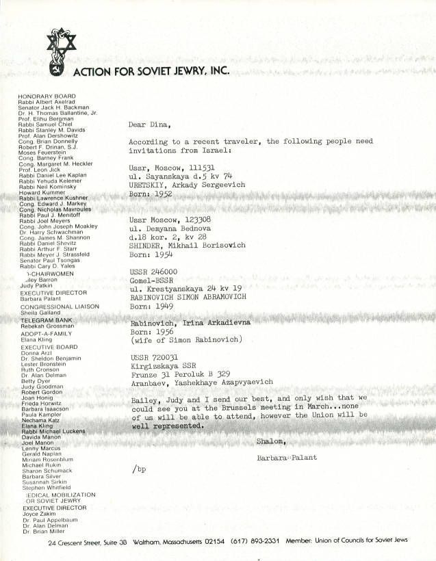 Letter with a list of Soviet Jews in need of invitations from Israel.