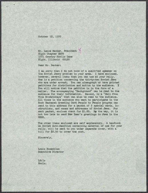 Cleveland Council on Soviet Anti-Semitism, Union of Councils for Soviet Jews, Rosenblum, Louis, B'nai B'rith Youth Organization, National Federation of Temple Youth, United Synagogue Youth, Temple Anshe Amunim (Pittsfield, Mass.), Jewish Youth Council (Detroit, Mich.), Jewish Community Relations Bureau, National Federation of Temple Youth. Chicago Area Region., B'nai B'rith Hillel Foundations, Weinstein, David, Silverstein, Sandy, Levine, Phillip, Knisbacher, Mitchell, Jaffe, Russell M., Finkelstein, Peter, Bogart, Donald