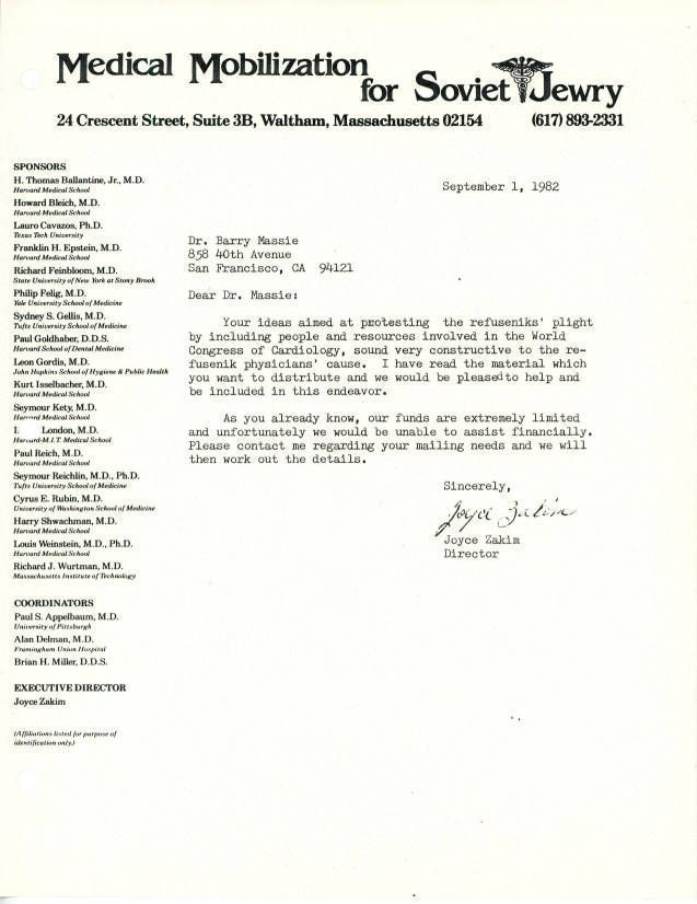 Letter regarding Massie's ideas to protest treatment of refusenik physicians.