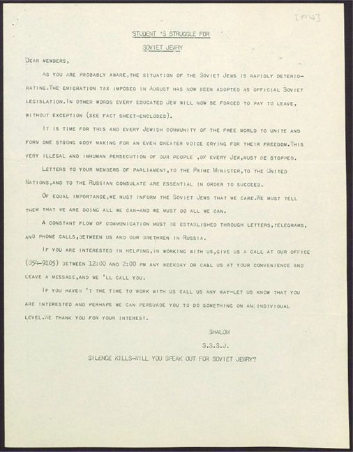 Cleveland Council on Soviet Anti-Semitism, Union of Councils for Soviet Jews, Rosenblum, Louis, Montreal Student Struggle for Soviet Jewry, McGill University. B'nai B'rith Hillel Foundation, Zalmanson, Silva, Ingber, Abie I., 1950-