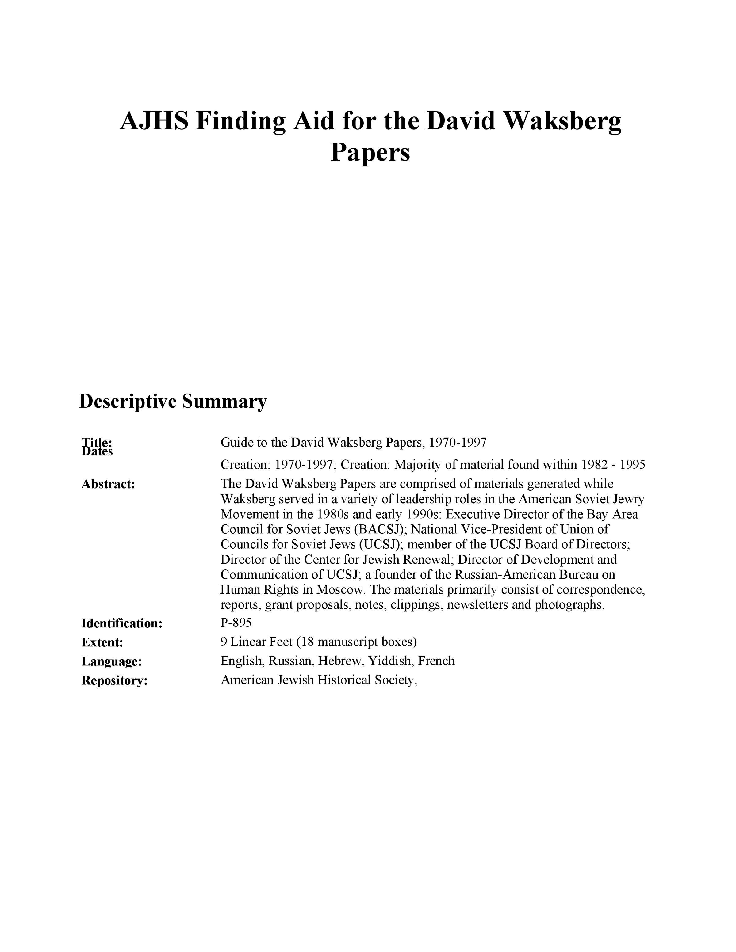 The bulk of the collection concerns the activities of the Northern California Lawyers Committee, Soviet Jewry Legal Advocacy Center, and Union of Councils for Soviet Jews, with additional sporadic publications issued by other Soviet Jewry Movement organizations. The collection includes individual case files on Soviet Refuseniks Yosif Begun, Ida Nudel, and Anatoly Shcharansky. In addition there are background research materials related to the Soviet constitution, Soviet legal system and its regulations on emigration, employment, internal passport system, penal system, secrecy topics, postal correspondence and other spheres. The bulk of materials pertain to the mid to late 1970s until the early 1980s.Lexicon