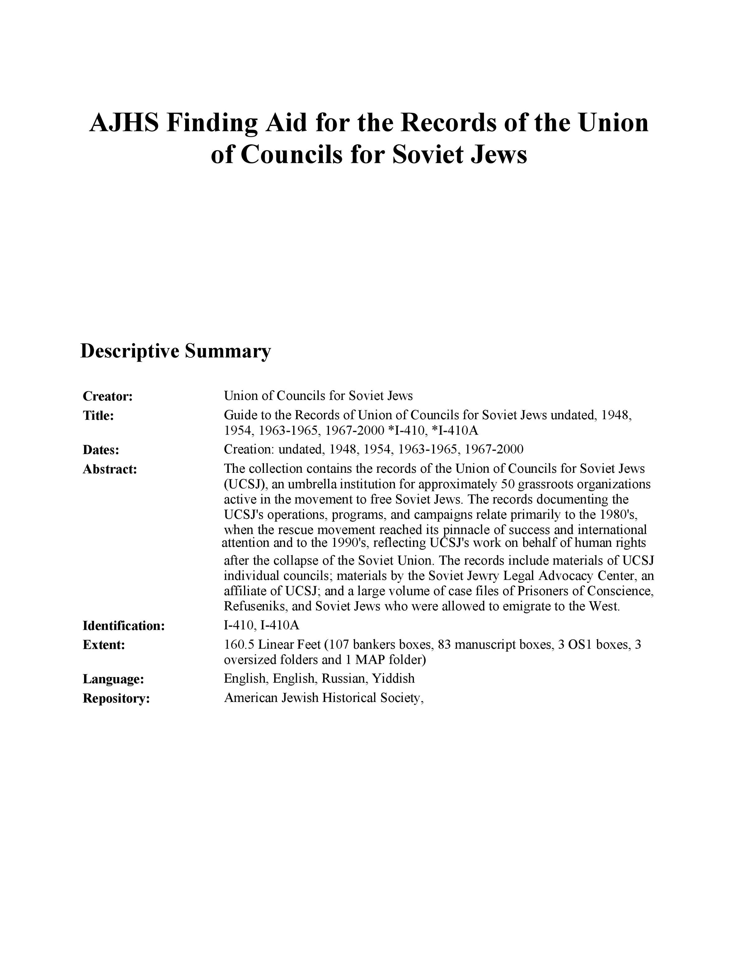 American Jewish Historical Society finding aid for the records of Union of Councils for Soviet JewsEntry/Object ID