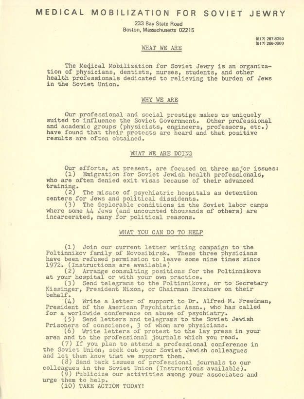Information sheet on Medical Mobilization for Soviet Jewry.