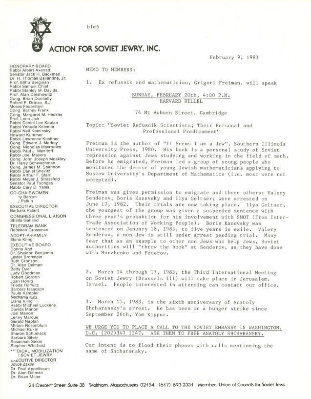 Union of Councils for Soviet Jews, Shcharansky, Anatoly, Freiman, G. A.