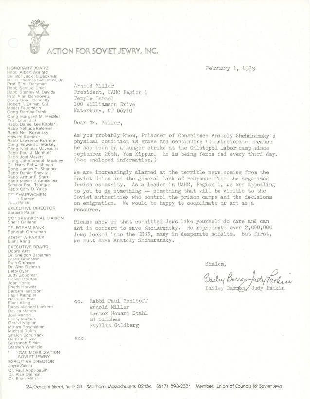 Letter asking the UAHC to do something to help in aiding Anatoly Shcharansky.
