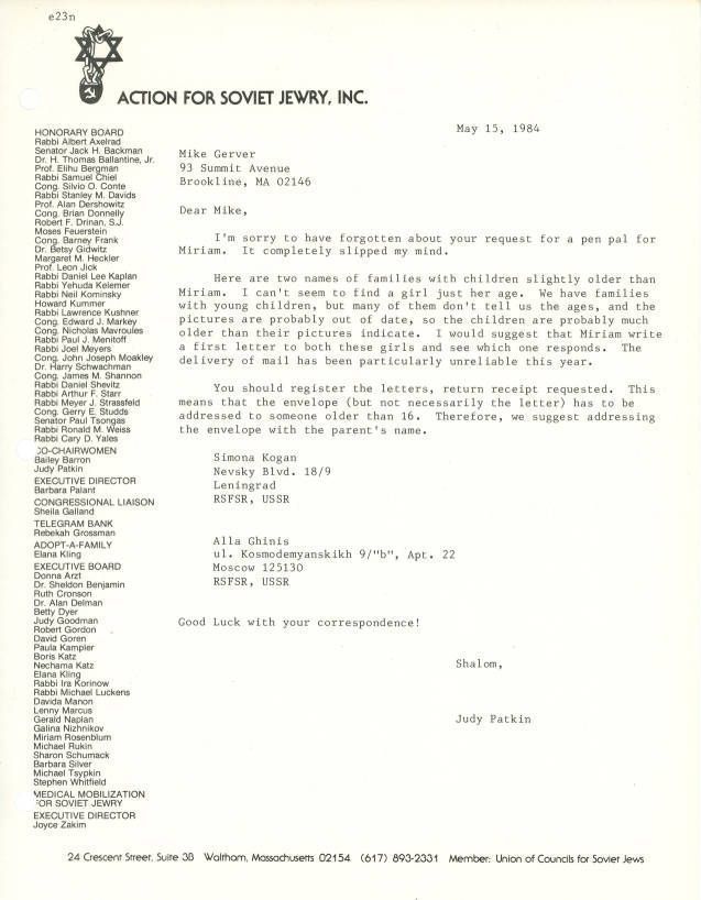 Jews -- Massachusetts -- Boston, Refuseniks, Emigration & immigration, Jews, Soviet, Pen pals