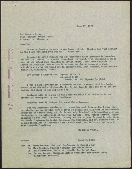 Cleveland Council on Soviet Anti-Semitism, Union of Councils for Soviet Jews, Rosenblum, Louis, Minnesota Action Committee for Soviet Jewry, B'nai Abraham (Minneapolis, Minn.), American Red Cross. Minneapolis Area Chapter, Yugend, Marcia, Silverman, Judy, Sachs, Moses B., Levy, Jeffrey