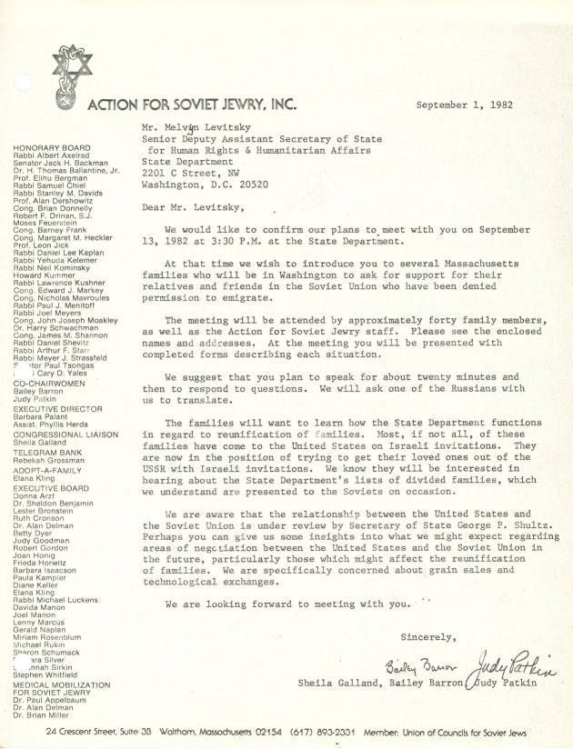 Letter confirming plans for Levitsky to meet with several families and Action for Soviet Jewry and outline what they are expecting from the meeting.