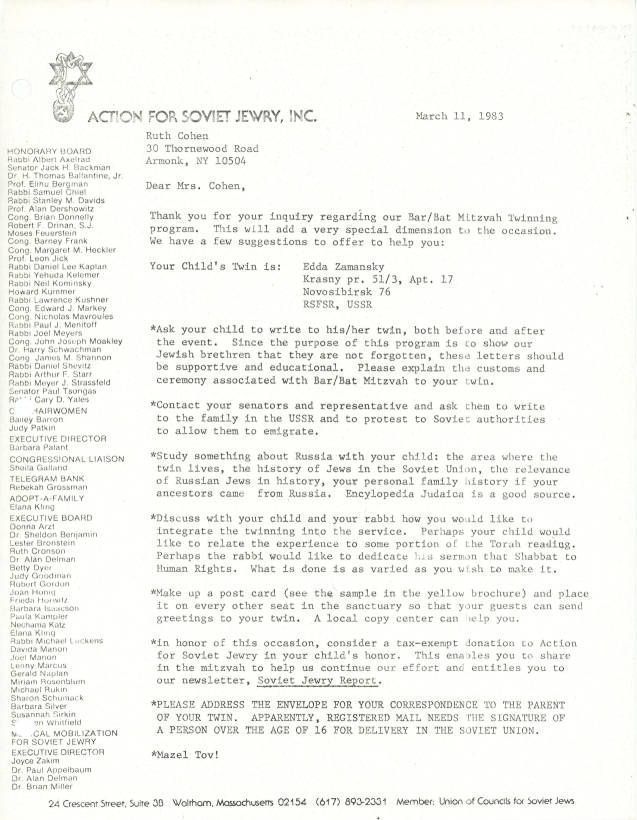 Letter with information on Lowitt's Bar/Bat Mitzvah twin and what to do next.