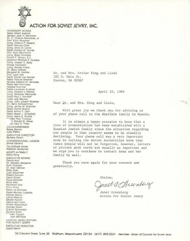 Letter thanking the Kings and Linda for making a phone call to the Kheifets family in Russia.Collection