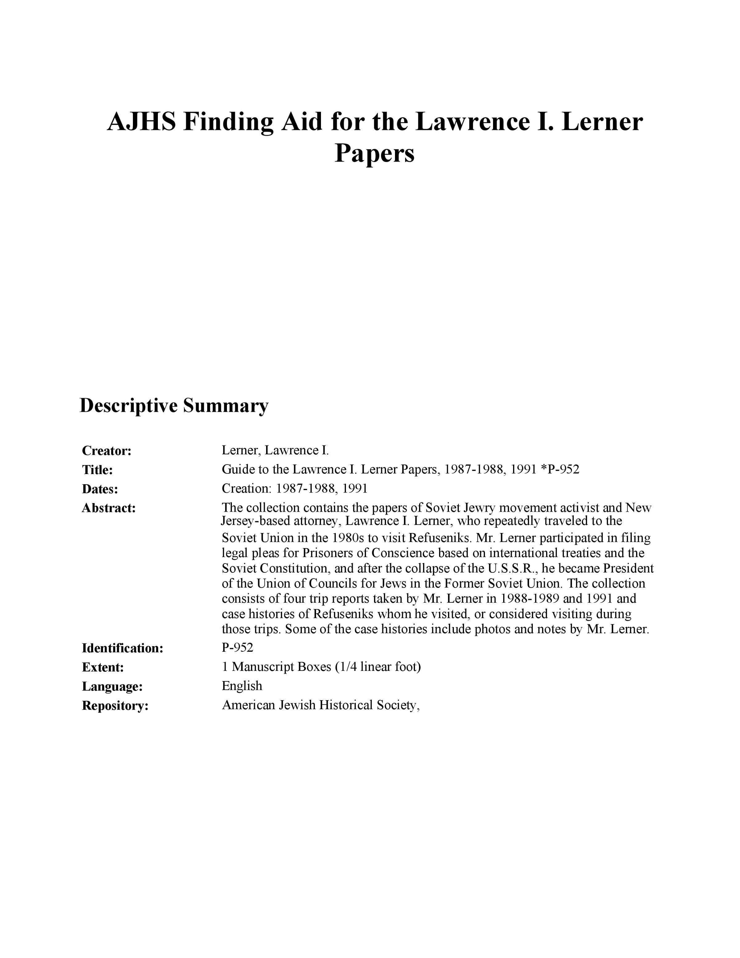 American Jewish Historical Society finding aid for the Lawrence I. Lerner papers