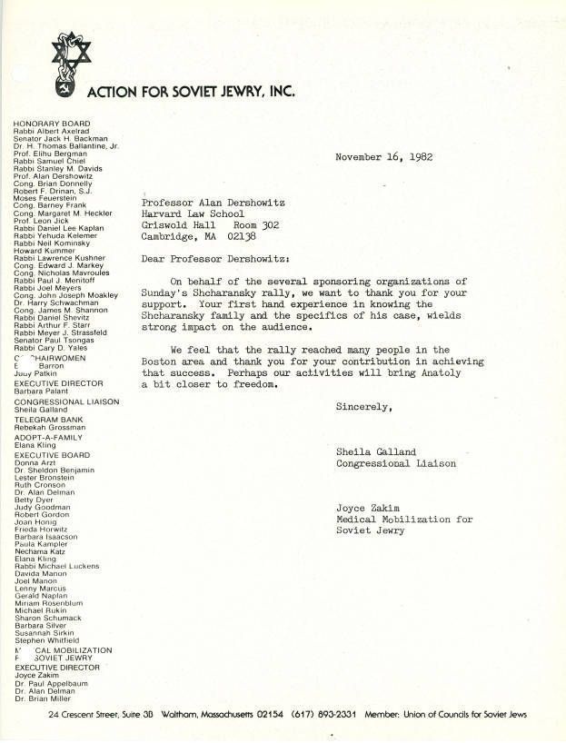 Letter thanking Dershowitz for his support at a Shcharansky rally.