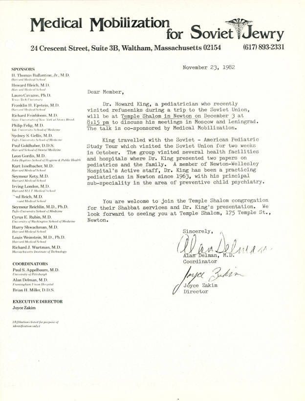 Correspondence - Alan Delman and Joyce Zakim to members of Medical Mobilization for Soviet Jewry