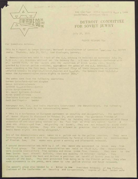 Box 10 folder 283 : Detroit Committee for Soviet Jewry, advisories