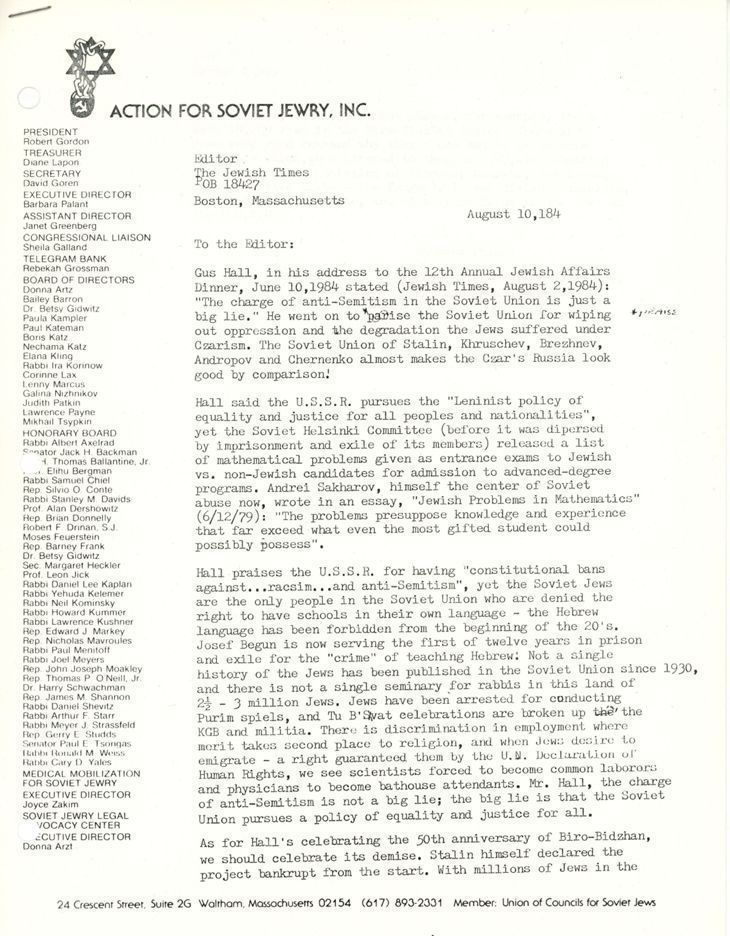 Letter criticizing Gus Hall's address to the 12th Annual Jewish Affairs Dinner for his inaccuracies about life for Jews in the Soviet Union.