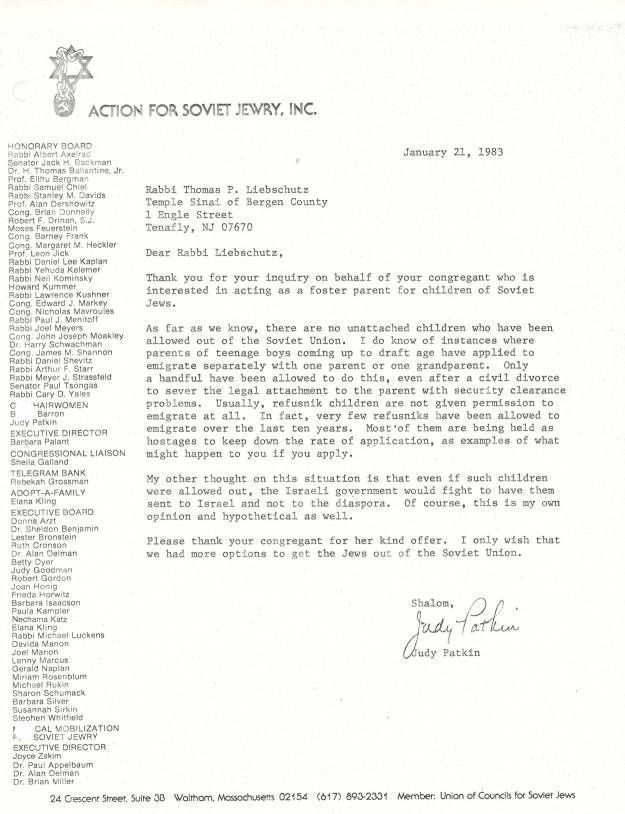 Correspondence - Judy Patkin to rabbi Thomas P. Liebschutz