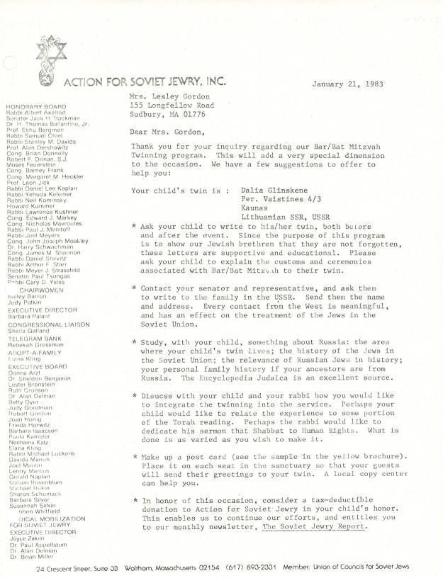 Letter with information on the Gordon's Bar/Bat Mitzvah twin and what to do next.