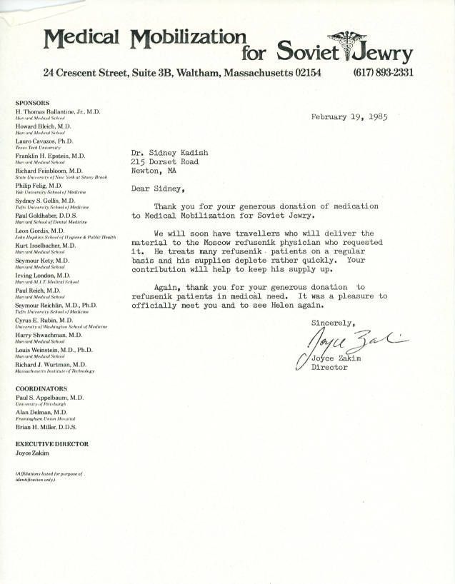 Jews -- Massachusetts -- Boston, Jews, Soviet, Emigration & immigration, Refuseniks, Donations, Physicians, Foreign aid programs