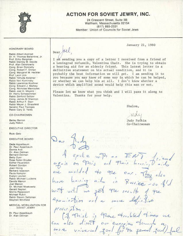 Letter asking for help in getting an elderly Soviet a hearing aid. Includes the response.