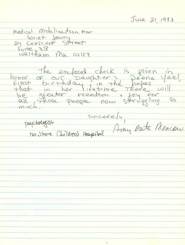 Correspondence - Amy Mats Mencow to Medical Mobilization for Soviet Jewry