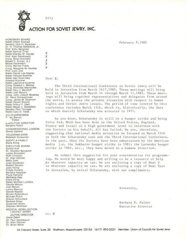 Letter announcing the Third International Conference on Soviet Jewry in Jerusalem and tying it to Anatoly Shcharansky's hunger strike.