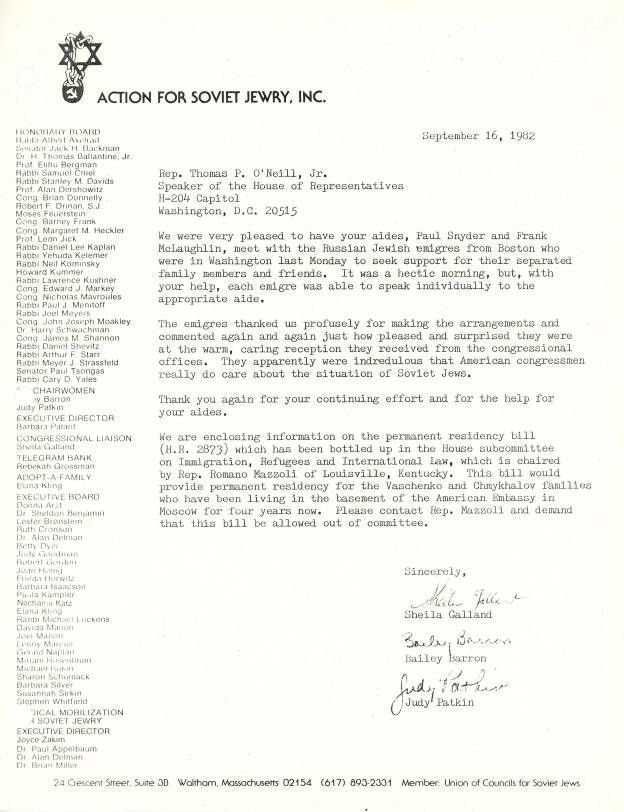 Letter thanking O'Neill for having his aides meet with Russian emigres about their families who are still in Russia. The Letter also presses O'Neill on a House bill stuck in a subcommittee.