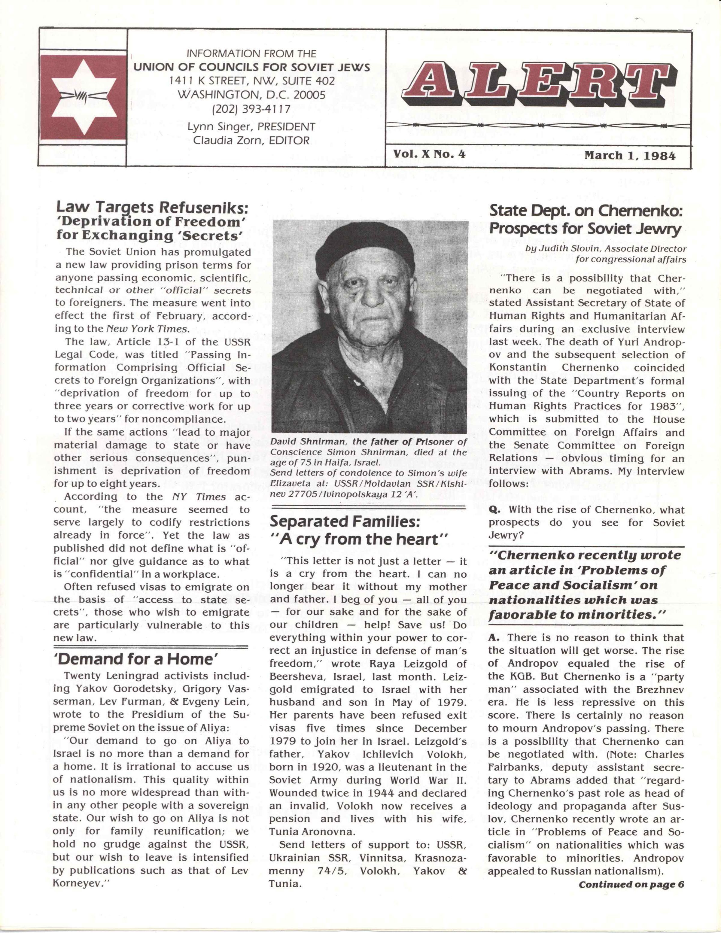 Refuseniks, Human rights, Shnirman, David, Shnirman, Simon, Political prisoners, Emigration & immigration, Chernenko, K. U. (Konstantin Ustinovich), 1911-1985, Sandberg, Joel