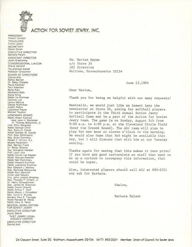 Letter regarding the Third Annual Soviet Jewry Softball Game.
