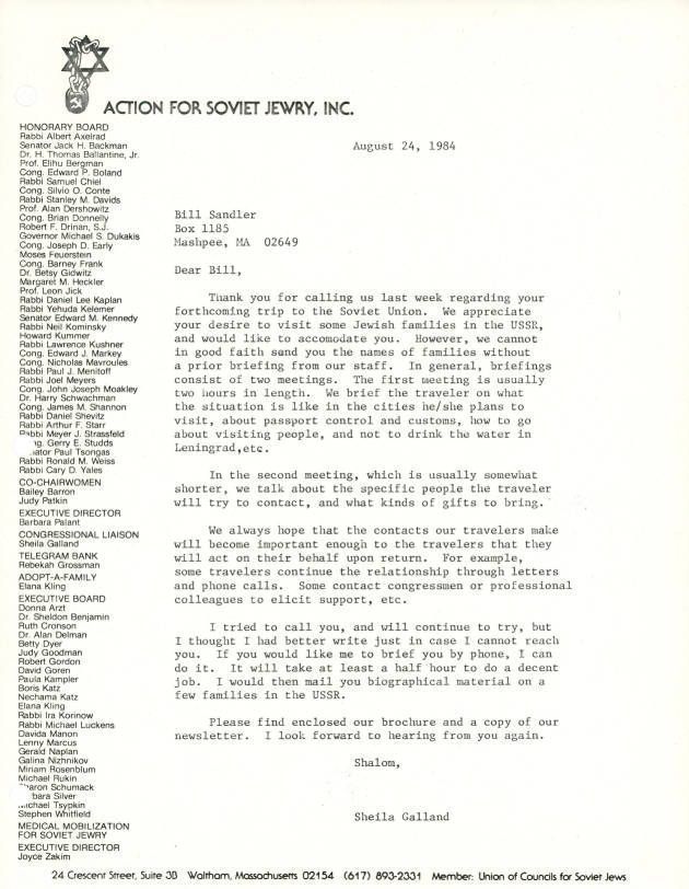 Letter explaining the briefing process for people wishing to travel to the Soviet Union and meet with refusenik families.