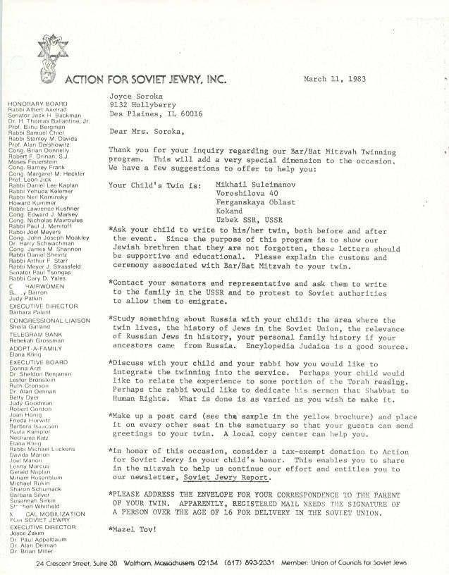 Letter with information on Soroka's Bar/Bat Mitzvah twin and what to do next.