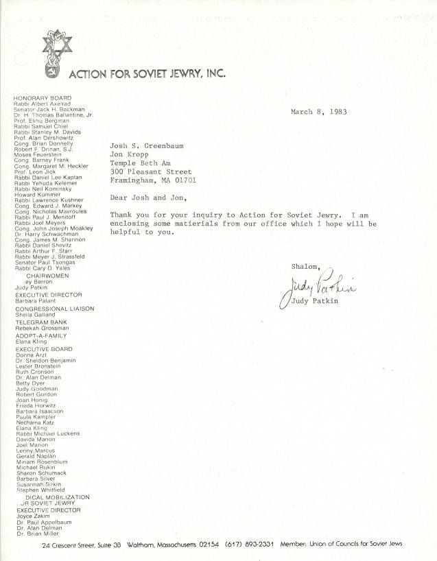 Letter enclosing information on the Action for Soviet Jewry.Collection