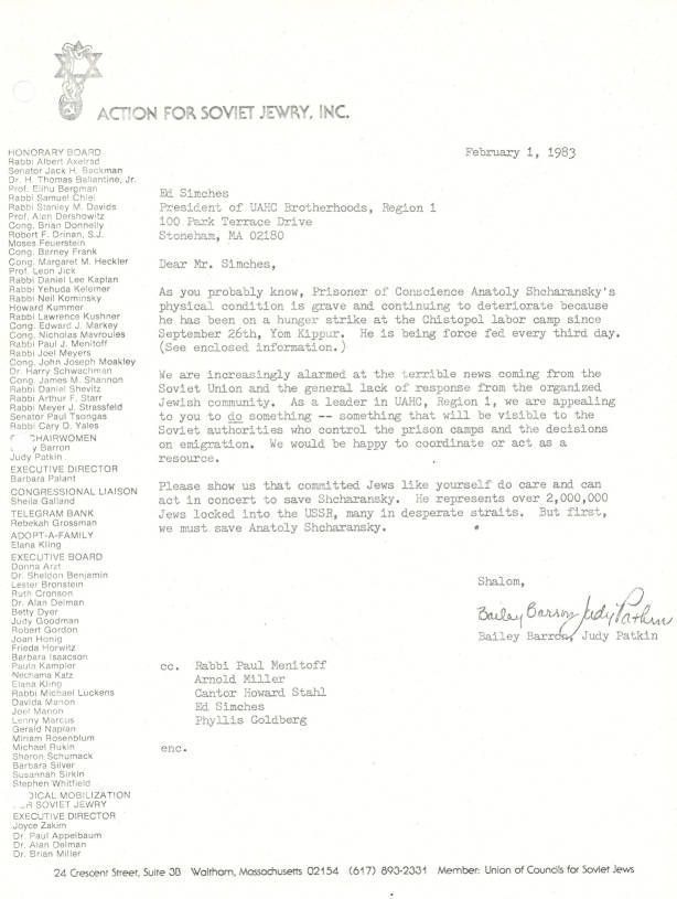 Letter asking for help from the organization to find ways to aid Anatoly Shcharansky.