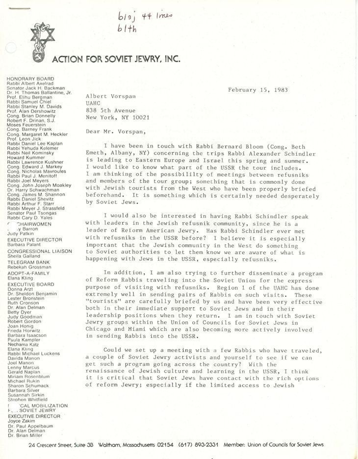 Letter on a variety of topics, including seeing if meetings between a UAHC tour group to the Soviet Union, let by Rabbi Alexander Schindler, could meet with refuseniks.Collection