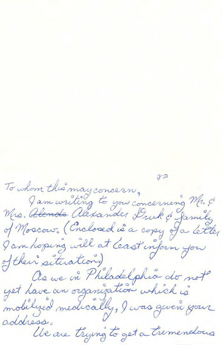 Letter asking for help aiding Alexander Druk and his family in Moscow. Letter indicates a letter was enclosed from the family explaining their situation.Collection