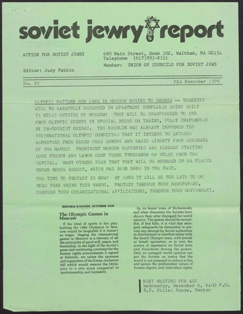 Box 10 folder 285 : Massachusetts Soviet Jewry Action Group, Soviet Jewry report and action for Soviet Jewry actiongram