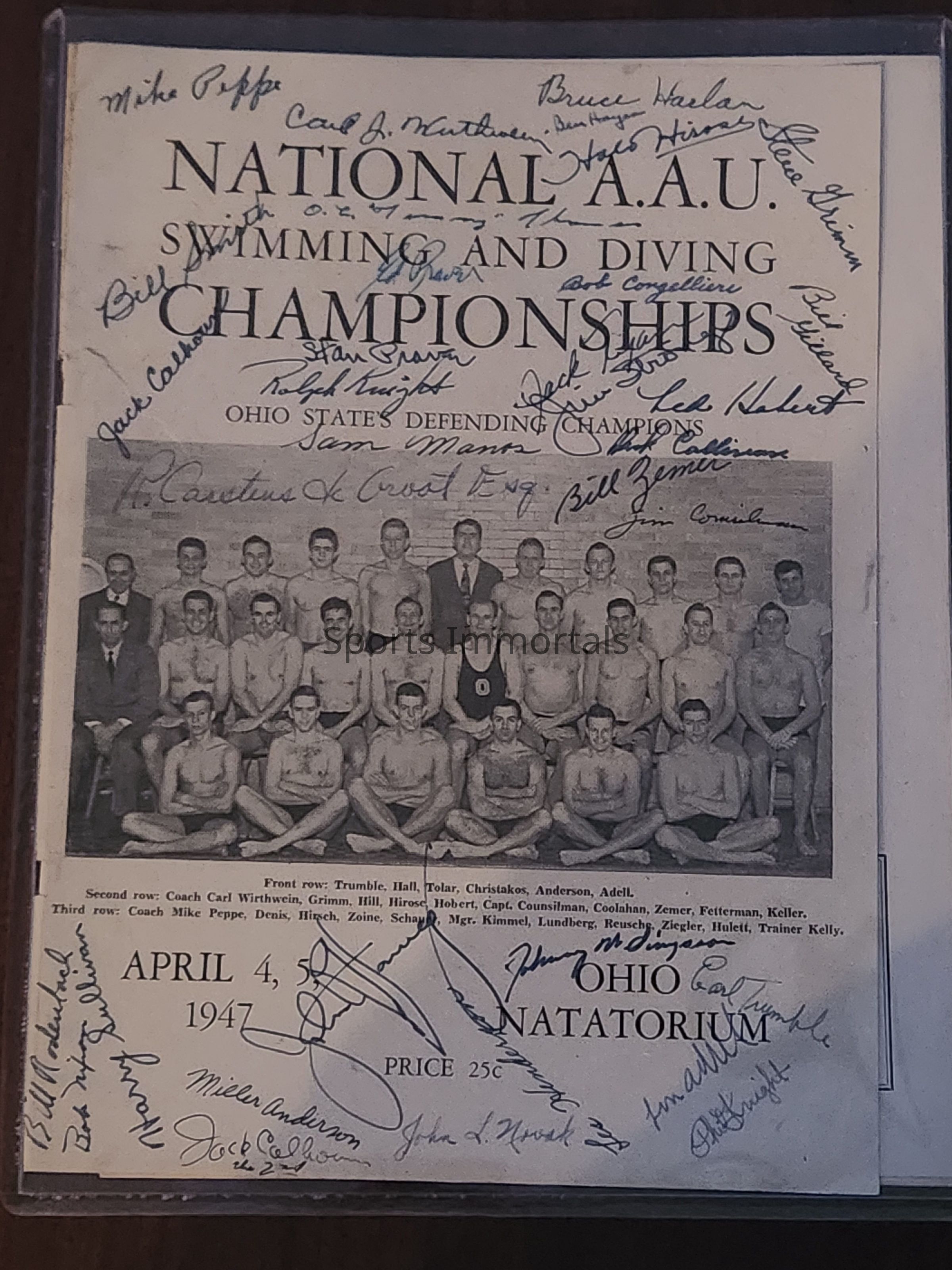 1947 National AAU Swimming and Diving Championship program signed by 32 participants