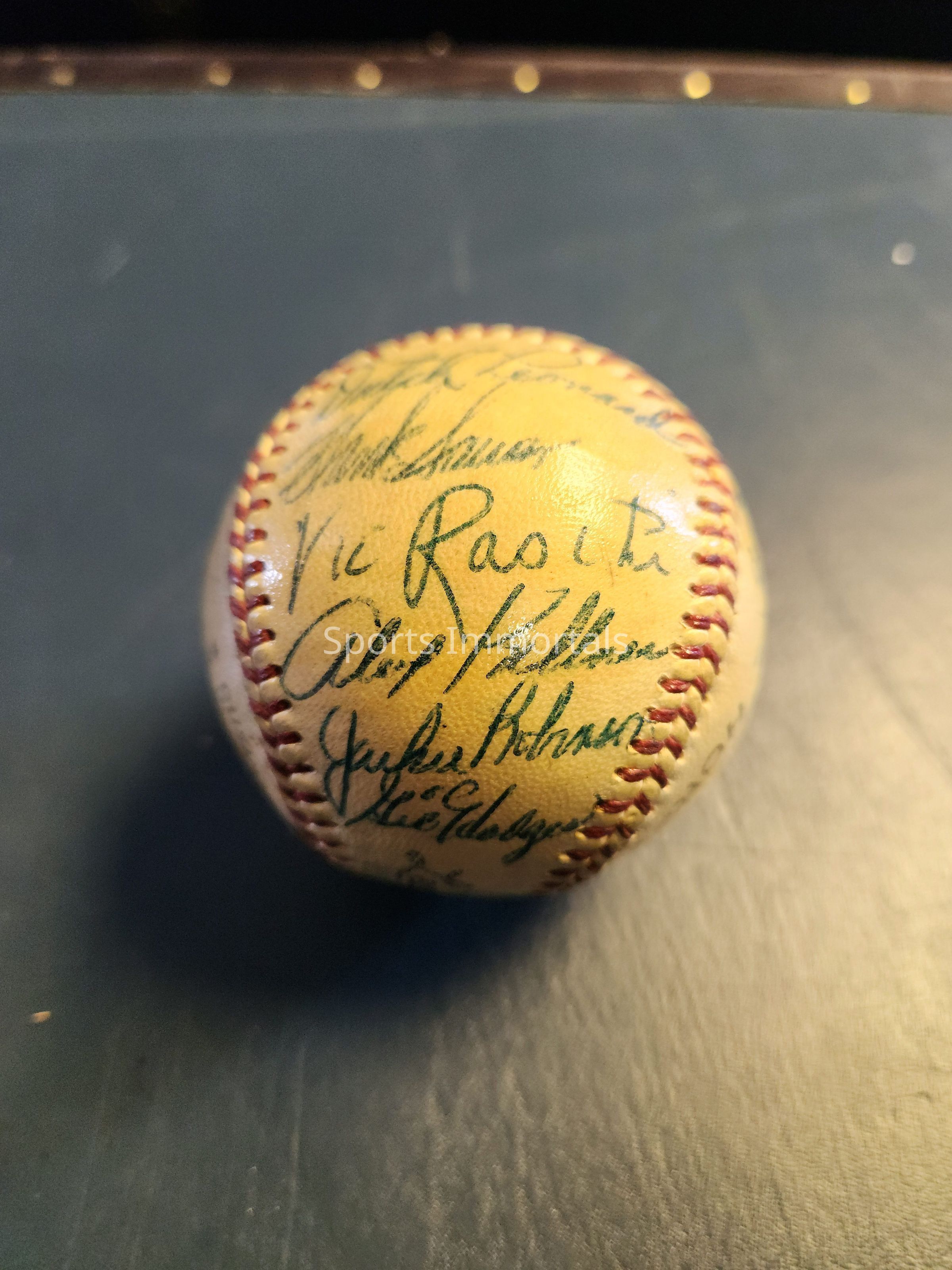 Baseball Signed By 1950's All Stars; Roy Campanella, Duke Snider, Harvey Haddix, Gus Bell, Ralph Kiner, Ted Kluszewski, Ed Mathews, Pee Wee Reese, Willie Mays, Stan Musial, Connie Mack, Red Schoendienst, Dutch Leonard, Hank Sauer, Vic Raschi, Alex Keller, Jackie Robinson and Gil Hodges