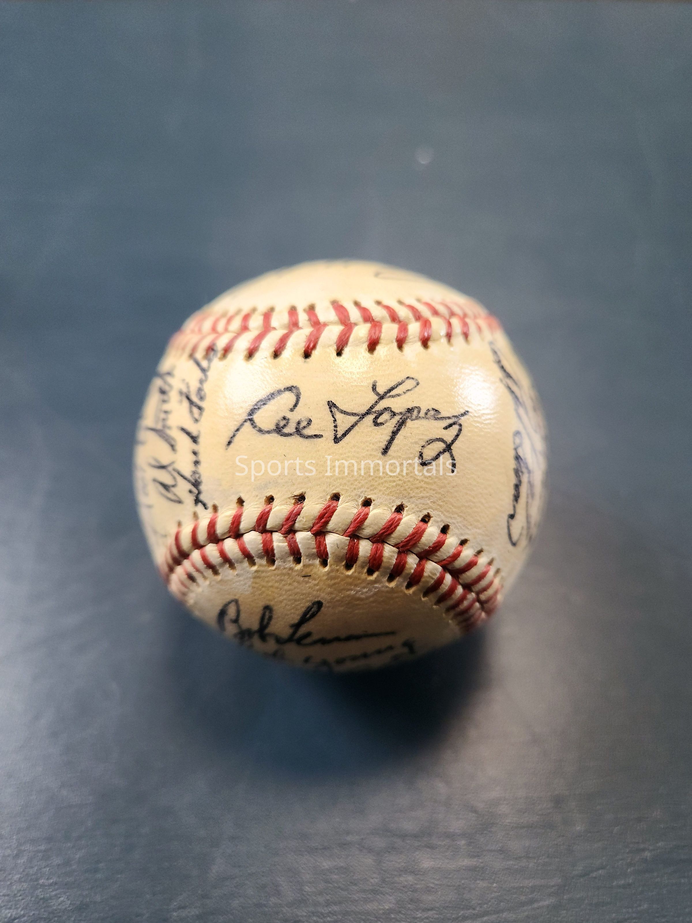 Autographed Baseball signed by 1955 Cleveland Indians; Fain, Rosen, Kress, Narleski, Lemon, Young, Lobe, Mossi, Hegan, Wertz, Woodling, Evers, Smith, Lopez, Kuhn, Strickland and others