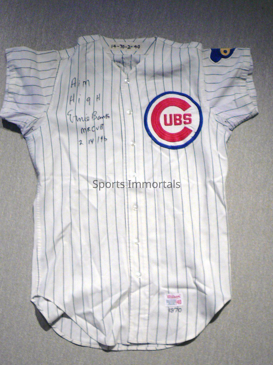 1970 Ernie Banks autographed Cubs game worn white home jersey (Wilson size 40 #14; Set 2). It is signed twice; Once "Best Wishes"; second "Aim High." The tagging has 14/70/2/40.