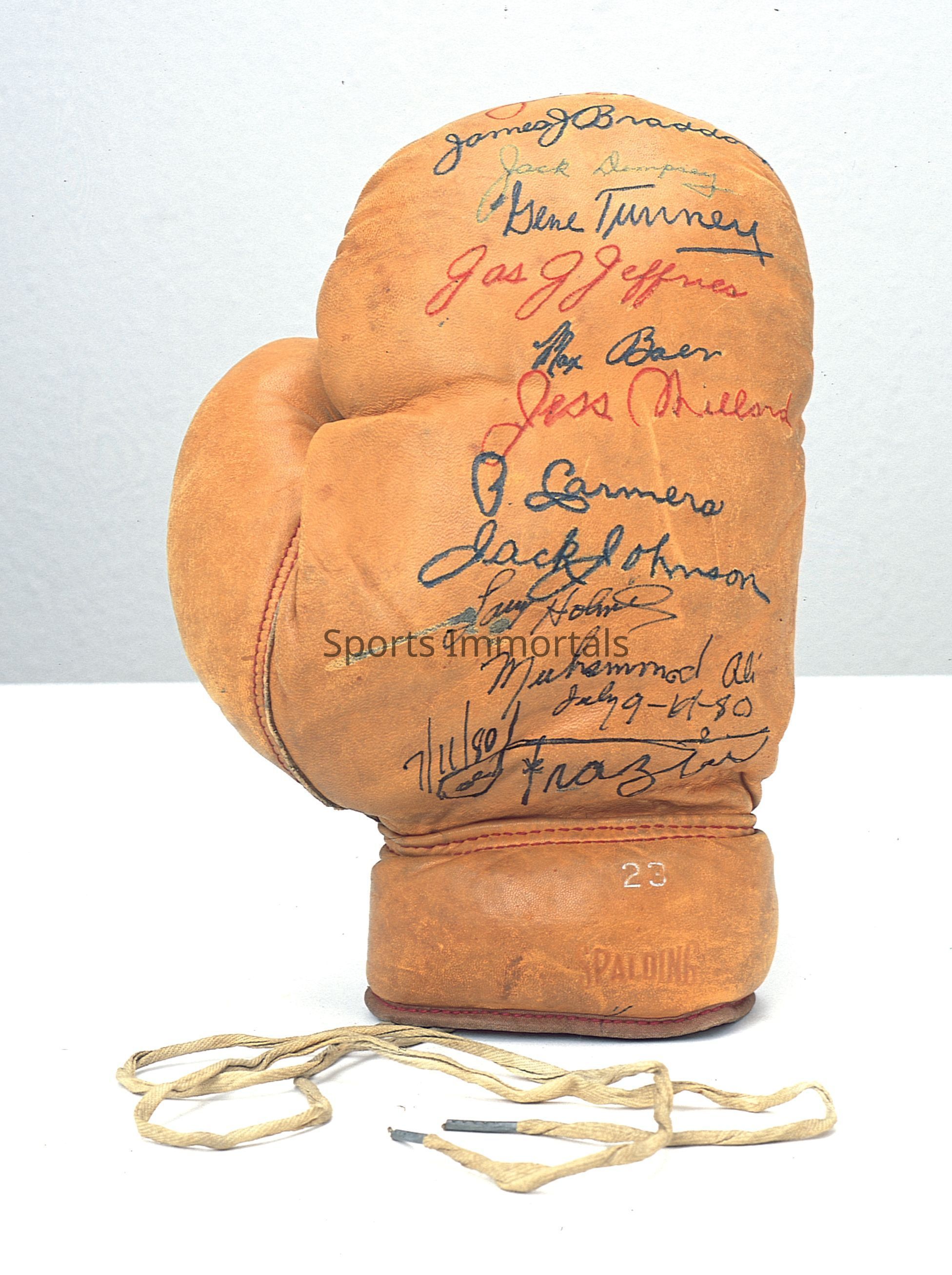 Autographed Gloves Attributed To Being Worn By Jack Johnson. First glove is signed by Frazier, Ali, Holmes, Jack Johnson, Primo Carnera, Jess Willard, Max Baer, James J. Jeffries, Gene Tunney, Jack Dempsey, James Braddock And 1 Other. The other is signed by Larry Holmes, James J. Braddock, Freddy Steele, Lou Ambers, Barney Ross, Billy Conn, Sixto Escobar, Alexis Arguello, Muhammad Ali, Joe Frazier, Leon Spinks, Sugar Ray Leonard, Aaron Pryor and a few others