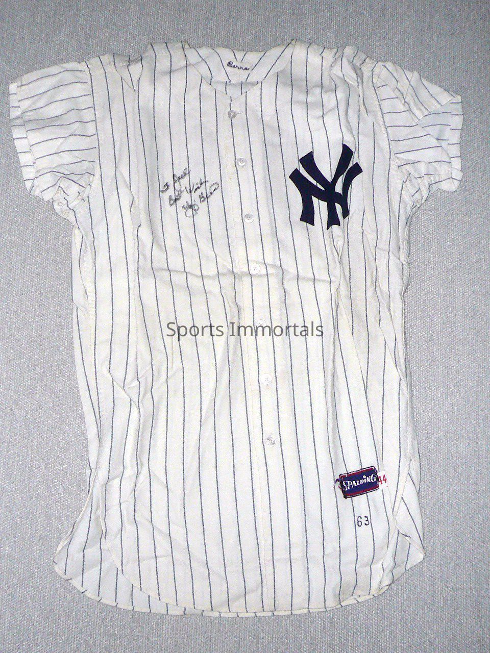 Yogi Berra 1963 autographed Yankees #8 jersey. Spalding size (44) white. Signed "To Joel Best Wishes." "Berra" is stitched in collar. Yankees lost to Dodgers in 1963 World Series (although unclear if jersey was worn in WS). 1963 was Berra's final year as player