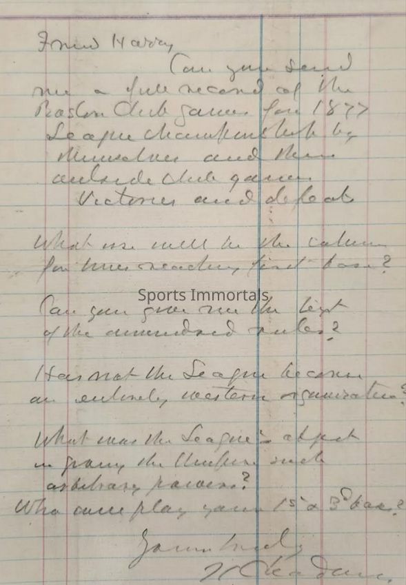 1878 autographed letter from Chadwick to Harry Wright asking 5 questions on the baseball season