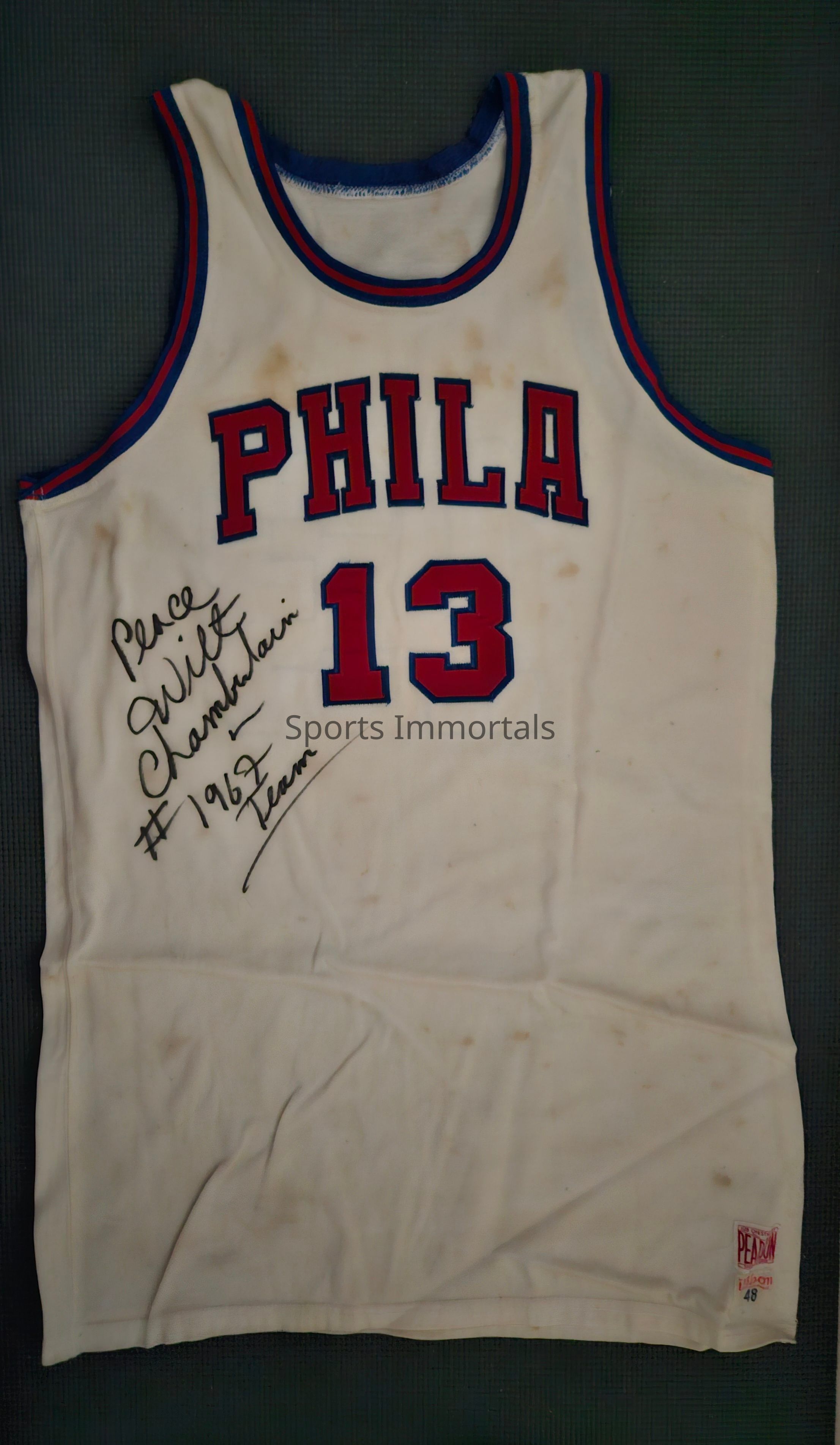 Wilt Chamberlain Philadelphia 76ers jersey. Signed on front "Peace, Wilt Chamberlain #1967 Team"
