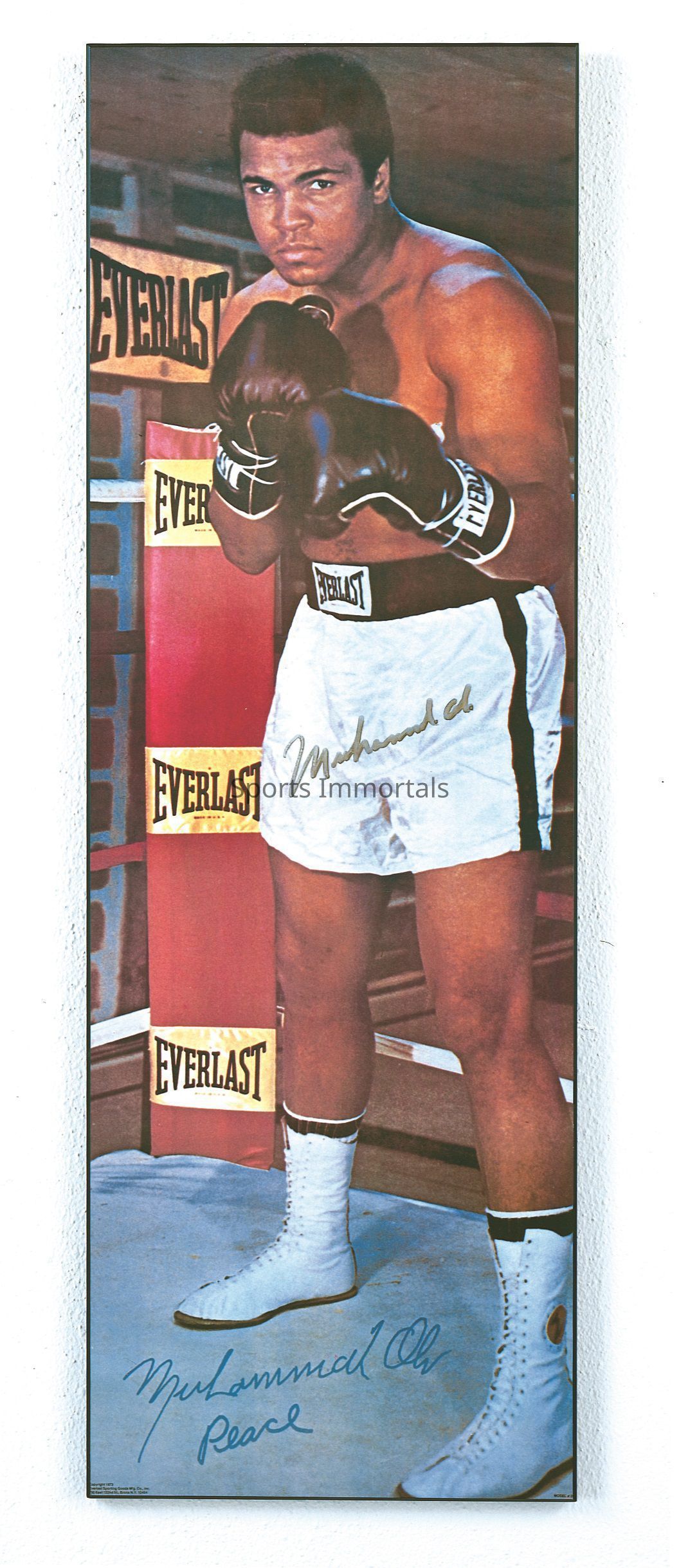 Autographed Laminated Fight Poster of Ali Wearing White Trunks