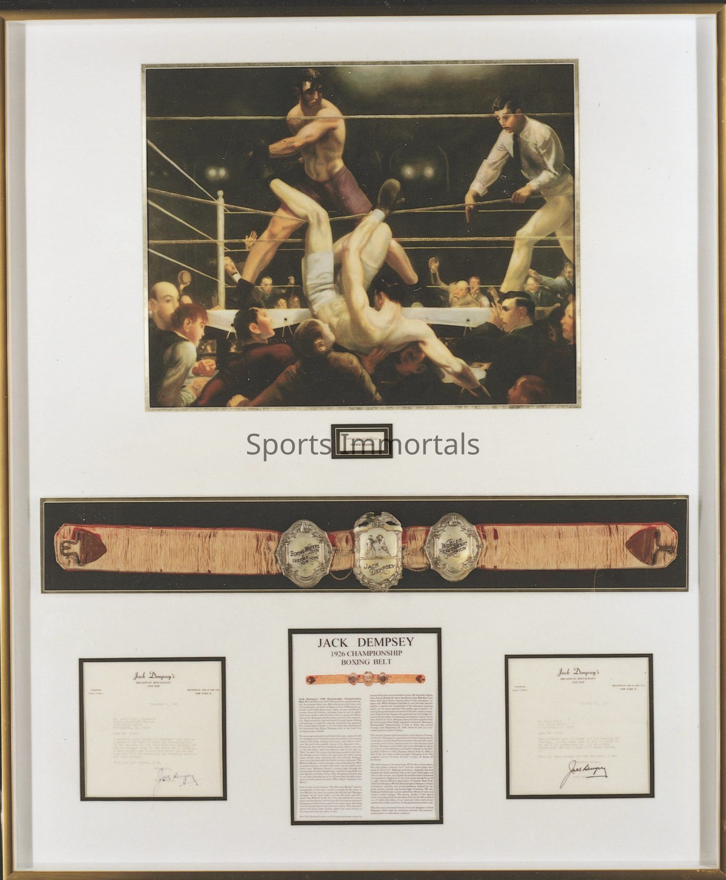 Jack Dempsey championship belt from 1926 with letter from Dempsey and a photo of Dempsey knocking out Firpo.