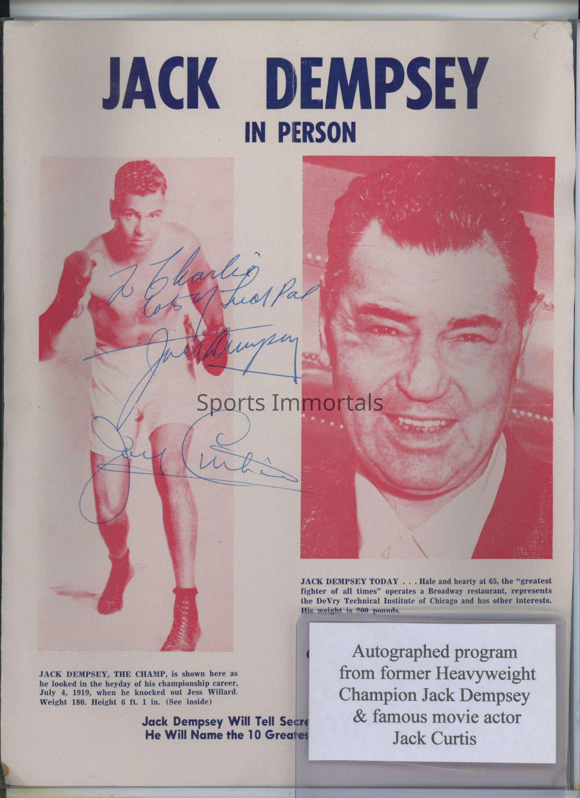 Program Signed By Dempsey And Vaudeville Actor, Jack Curtis