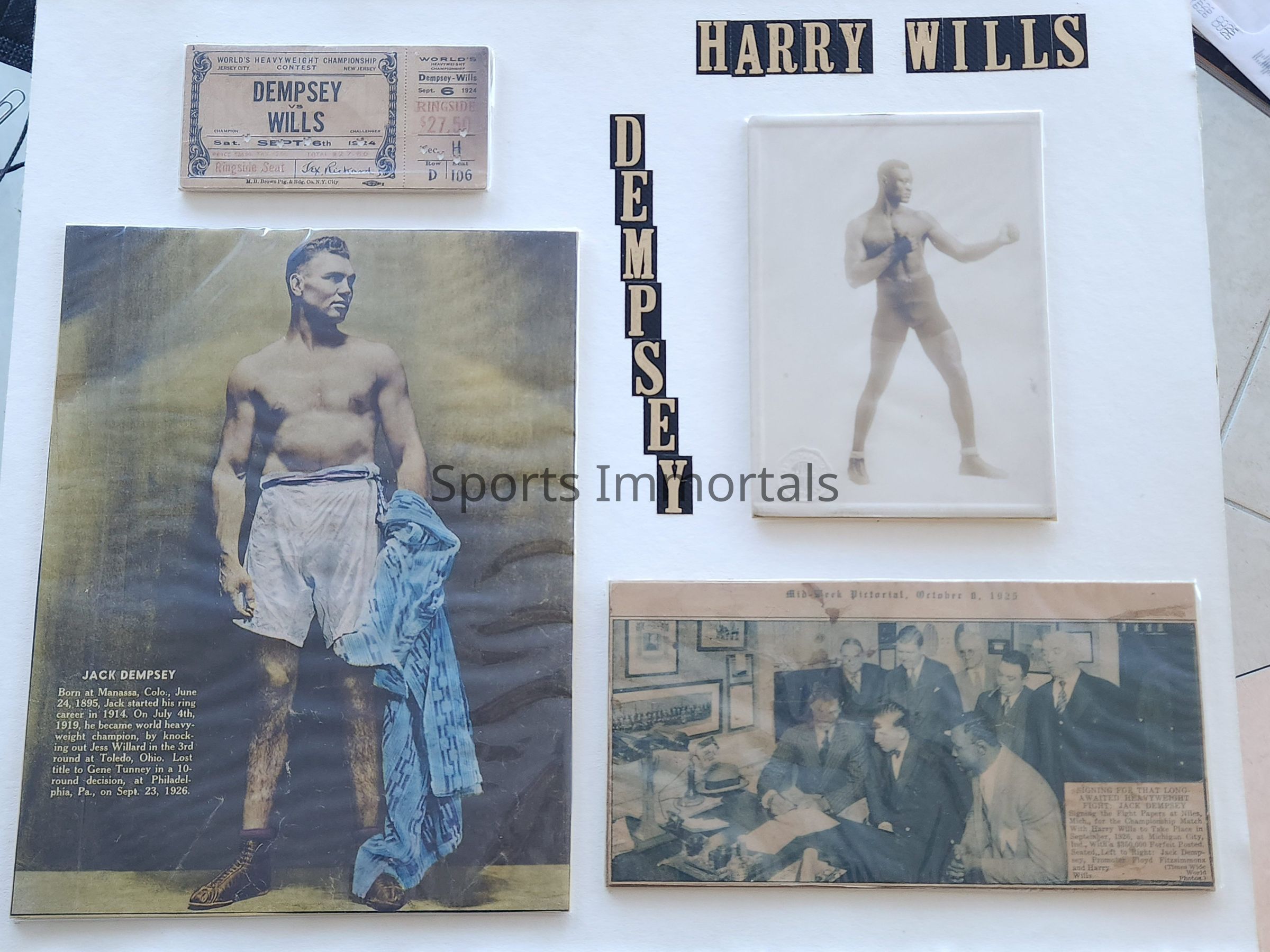 Ticket, Photos Of Each Fighter And Photo Of Signing Contract Between Harry Wills And Dempsey